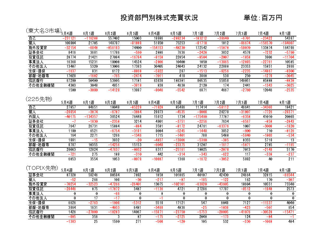 都銀・地銀等は売り越し継続。先物は225売り越し転換、TOPIX買い越し転換。