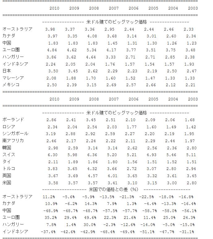 つぎに、ビッグマック指数から考えてみる。 2010年1月におけるビッグマック指数は別表の通りだ 日本のビッグマックはドルベース価格=3.5ドルだったがアメリカ本国でも3.58ドルとほぼ同じ価格である。この時の為替レートは1ドル=92円前後である。 ビッグマックの価格には人件費、厨房機器、店舗の内装、不動産賃貸価格が織り込まれておりさらに包装材や店舗備品、光熱費、水道料金、輸送費用といった生活に必要なコストは殆ど織り込まれている。そう考えるとなんか1ドル=79円はちょっと実態からかけ離れているようにも思える。