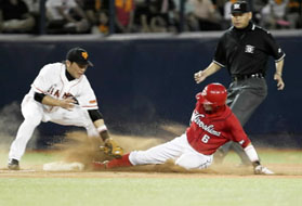 三回表、広島2死二塁、ヒューバーへの初球に三盗を決める梵。 三塁手脇谷 (撮影・佐藤哲紀)