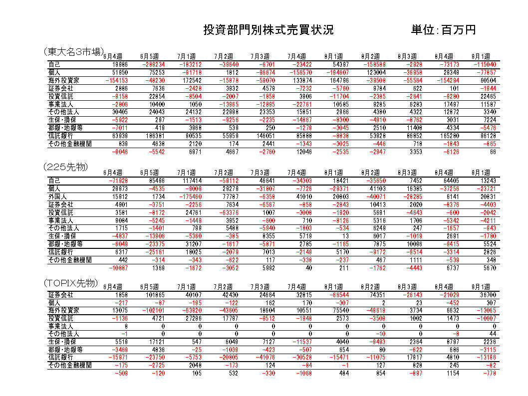 都銀・地銀等は売り越し転換。先物は225買い越し転換、TOPIX売り越し転換。
