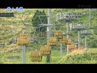 こちらでは、リフトをはざ木に見たてて イネの天日干しをしています。