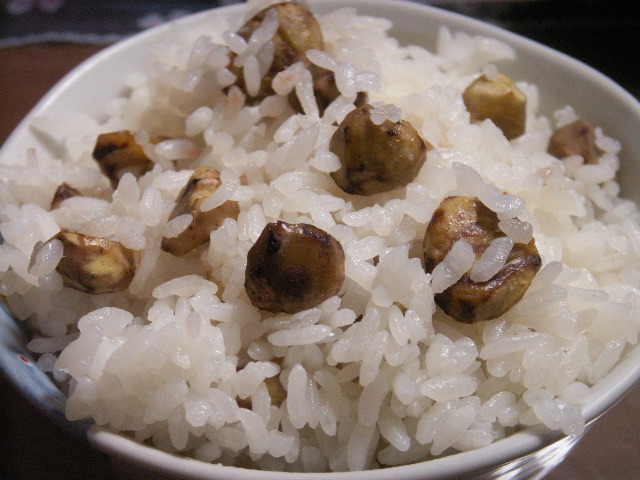 日曜日に山で採ってきた芝栗(しばぐり)で栗ご飯を作りましたぁ