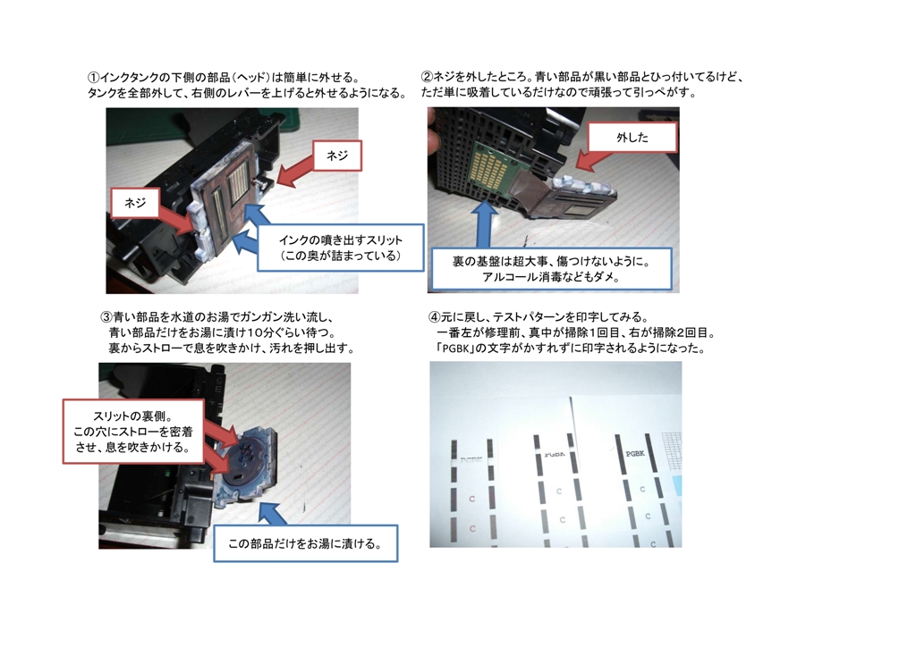 私の場合、純正じゃないインクを使ってたせいか頑固に目詰まりしてて、