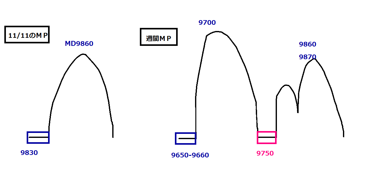 とりあえず上値の第1ポイント9860は突破、次の上値はトレンドライン上限が重なる9930~9980のポイント、これをこえたらさらに次に10060~10100あたりを見ればいいと思う。