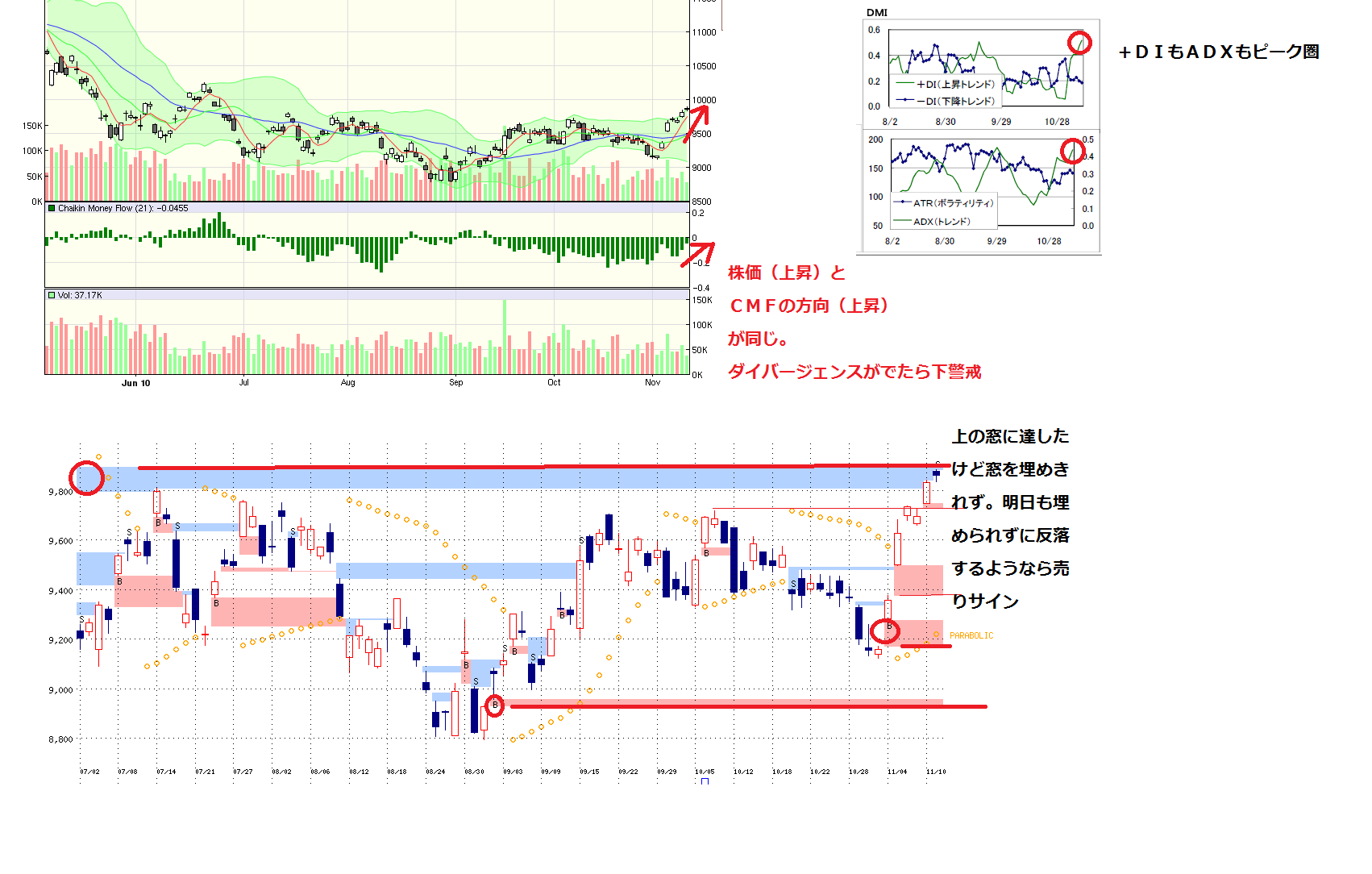 DMIはピークアウトしそうな感じ(上昇トレンドのピークアウト=下落、ではないので注意。高値もみあいもありえる)