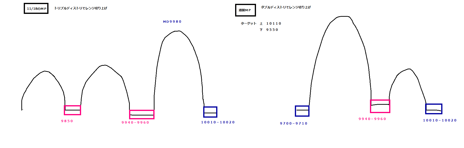 ・9940-9960のレッジをうめれば、再度9700↓への流れになると思いますが、それまでは売りは慎重に。