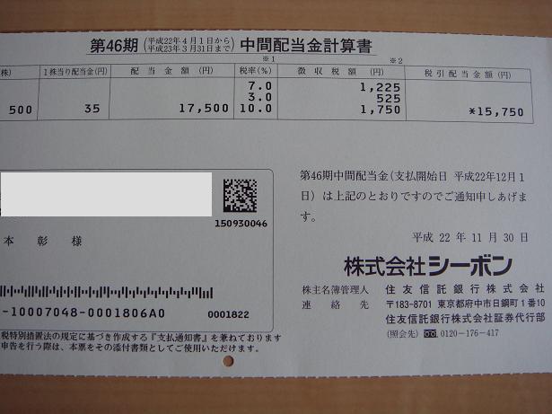 シーボン 4926 から配当金が届きました。