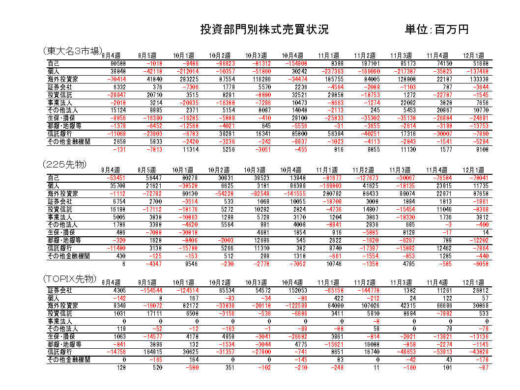 都銀・地銀等は売り越し継続。先物は225売り越し転換、TOPIX売り越し継続。