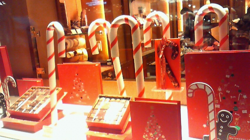 >さて、写真は先日私の好きなチョコレート屋さんの前と、ケーキ屋さんの前でのクリスマスデコレーション。