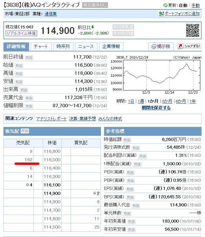 大納会でAQインタラクティブを買いました(111900で購入)。