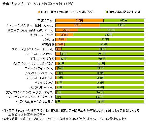 「カジノのテーブルゲームで、比較的控除率の高い(つまり客に不利な)とされるアメリカ式ルーレットの控除率は5.26%であり、1回に1000円ずつ2時間程度(約40回)賭け続けると、平均して2104円負ける結果となる。しかし、2時間の映画を観て2000円払うよりもルーレットを楽しみたい人がいるならば、それで良いのではないか。...宝くじは論外として、日本の公営ギャンブルの25%という控除率は完全に搾取のレヴェルであって、国民から健全な娯楽の機会を奪い取っているのである。...より健全な競争者としてのカジノ参入が待たれる理由なのである。」(谷岡一郎「ギャンブルフィーヴァー」中公新書(1996))