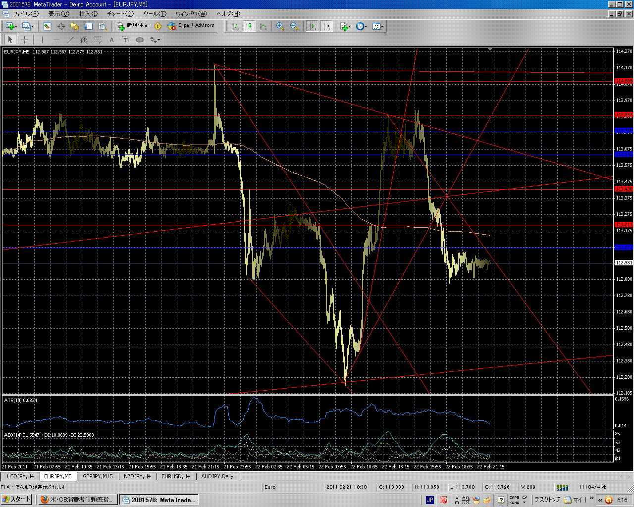 理由 : 添付図のように112.88、112.28と下値を更新している中、大きな上昇が2回発生し、113.88で上髭を確認した。ここに下落のトレンドラインを引いて113.88の4時間足レジスタンスと交差したポイントに損切りを入れ、逆張りトレード