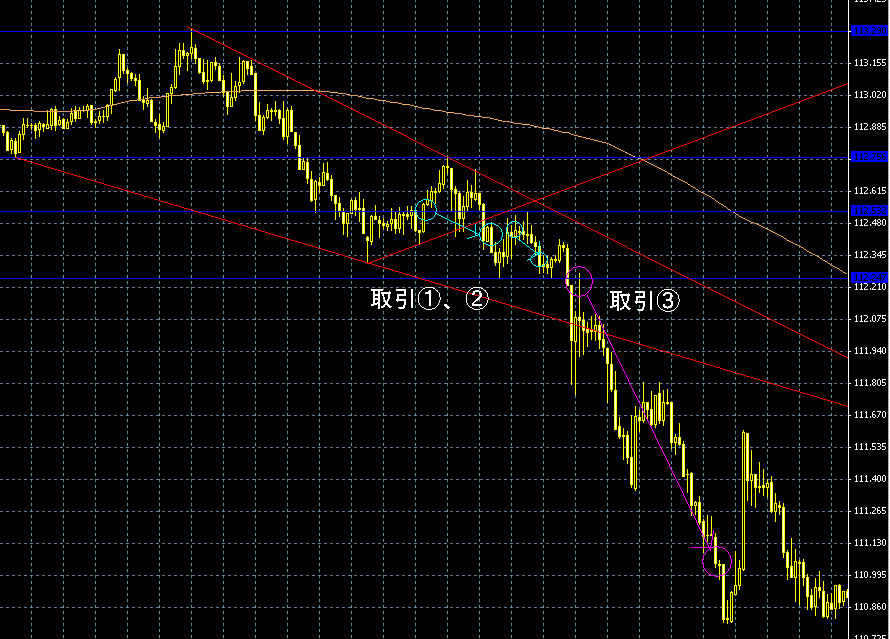 Title        :  ①、②のトレードから売りに転換し、相場の大陰線に当たったラッキートレード