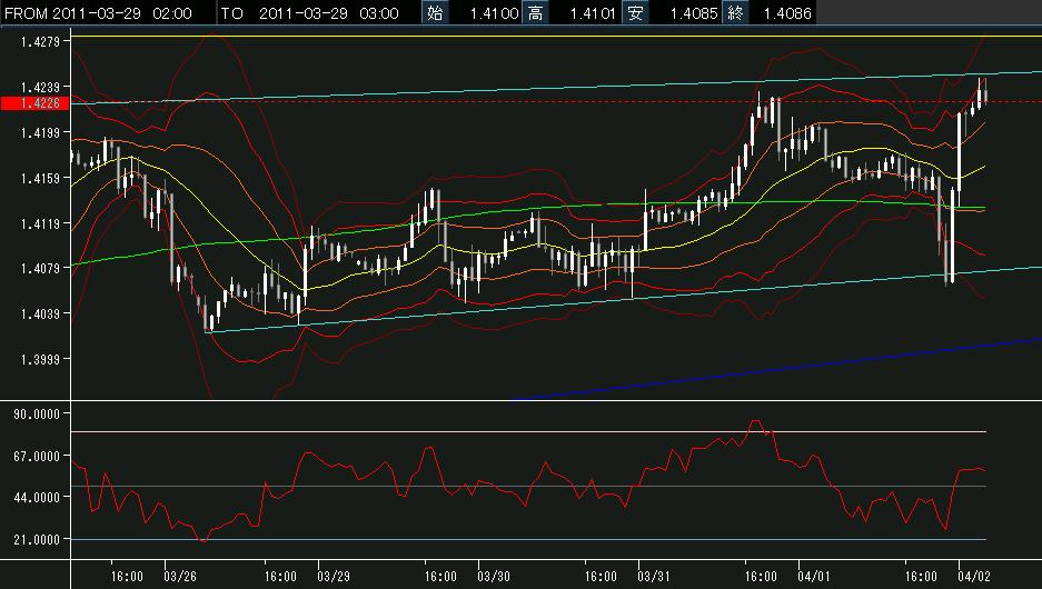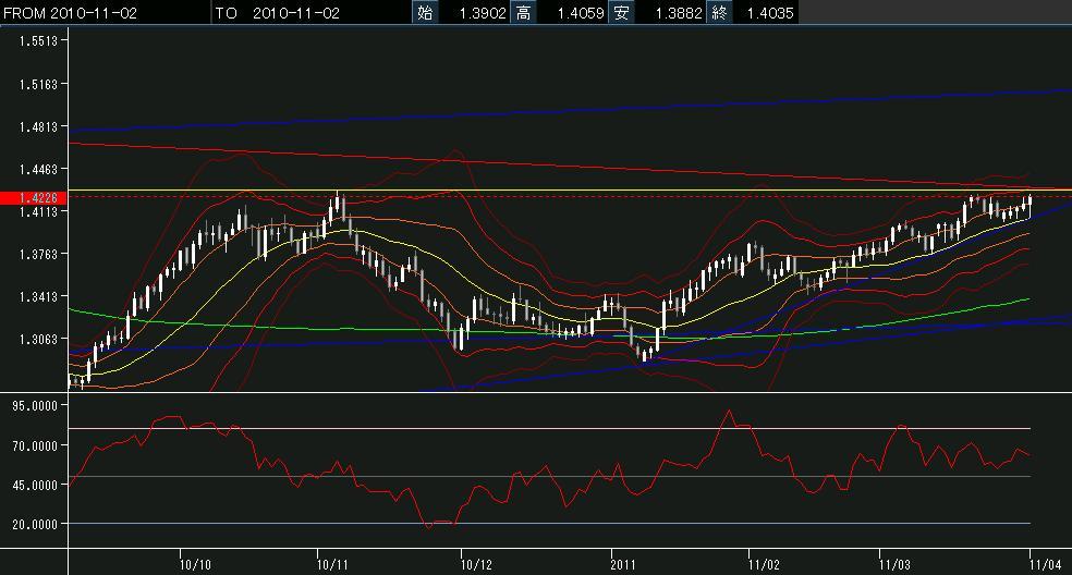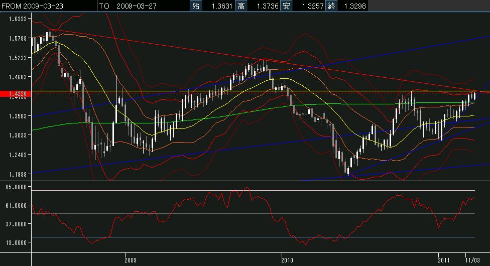 ユーロ$は、相変わらず1.4283に頭を抑えられて、週足レジスタンスにタッチできないでいます。