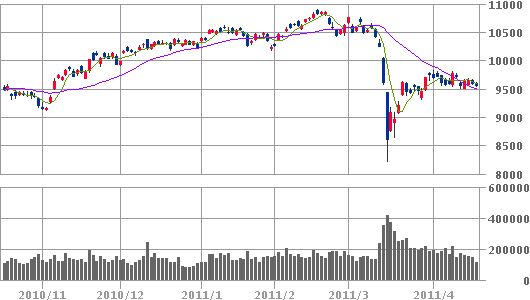 さて、今日の18(月)の東京市場は方向感のない展開。添付日経平均日足チャートでもおわかりのとおり、気付けば3月22日以降、かれこれ4週間近く¥9,400~9,800の狭い範囲での値動きに終始しておりまする。