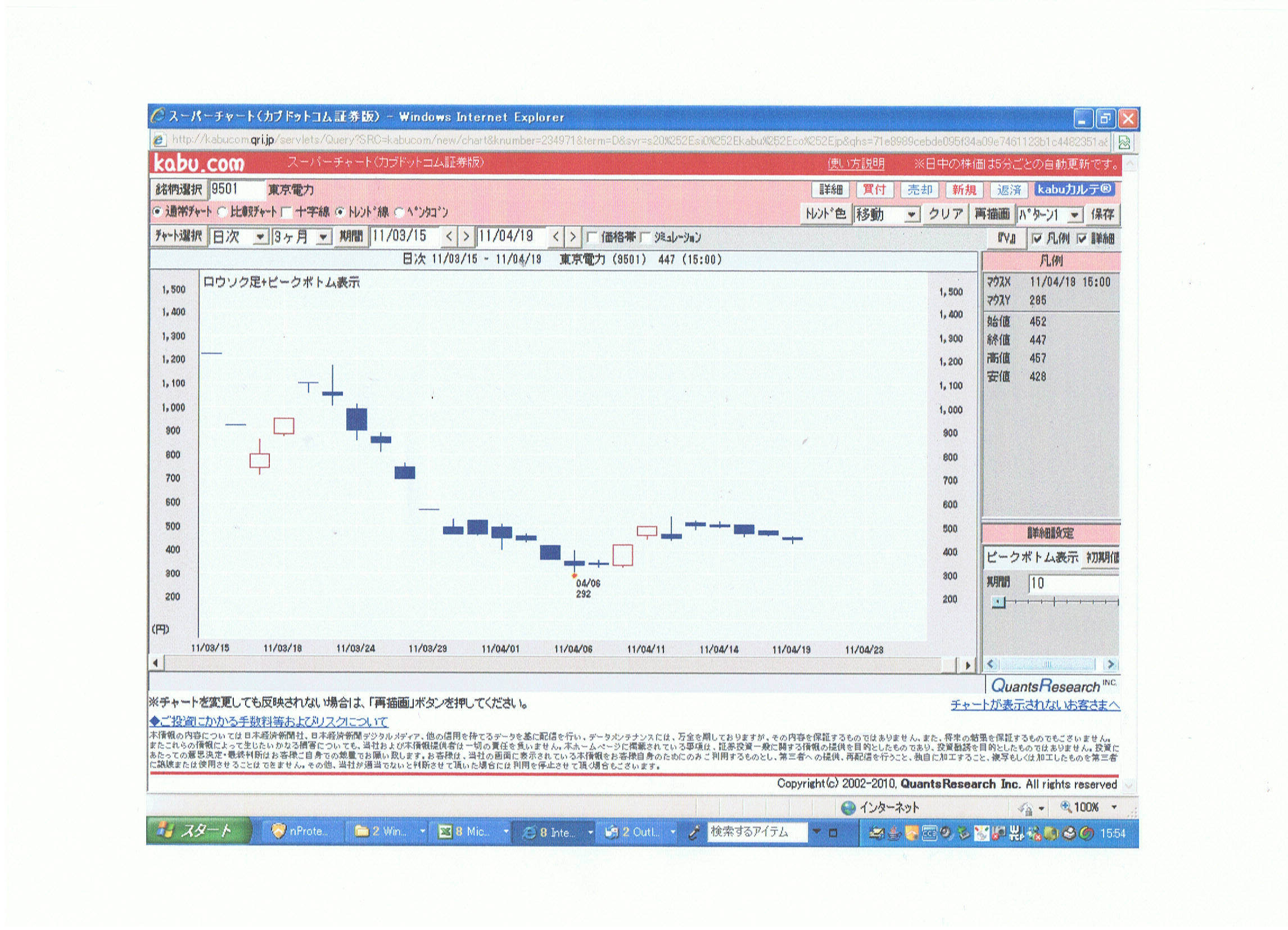 日数が多い株価チャートは値下がりが大きすぎるために最近の値動きがつぶれてしまい判りにくい。そこで暴落以降だけを表示したチャートを添付した。対数チャートでもつぶれは少なくなる。このところ東京電力の値動きは穏やかになり、緩やかだがはっきりした下落傾向が見て取れる。4/12にダマシに近い動きのため含み損を抱えてきたが、今日の下落による利益で含み損もほぼ解消した。ただ、明日買い転換すれば10万円近い損切りとなってします。売り玉がある限りしばらく下落を続けて欲しいものだ。