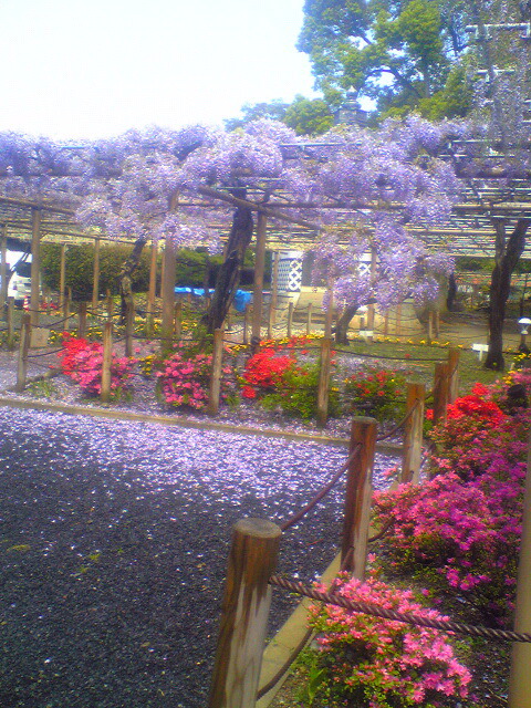 ツツジは綺麗に咲いています。急に降りだした雹のおかげで、こんな珍しい、咲きかけの花のじゅうたんが出現。1日限りの藤のじゅうたんにびっくりです。今週末からが見ごろ(Y)