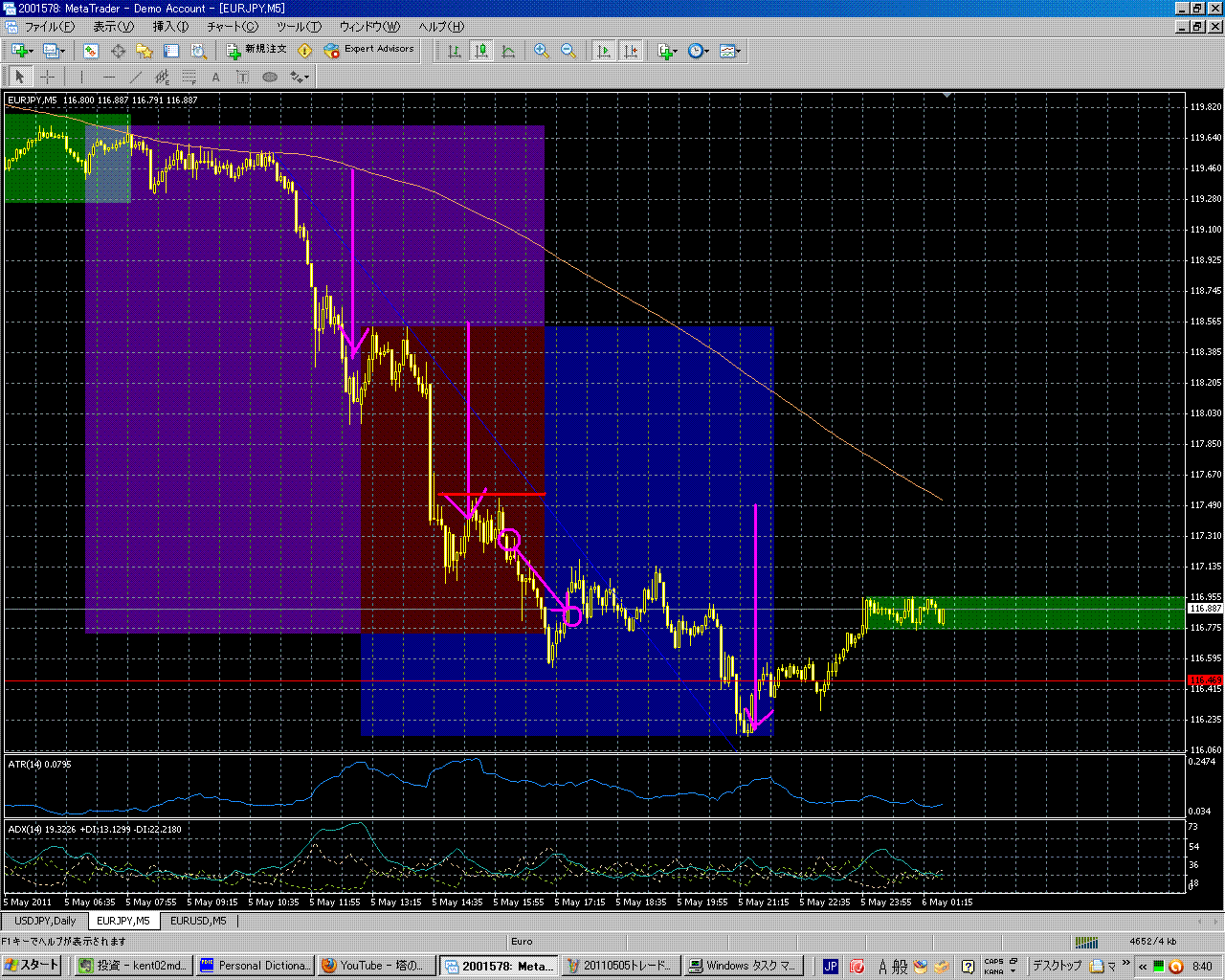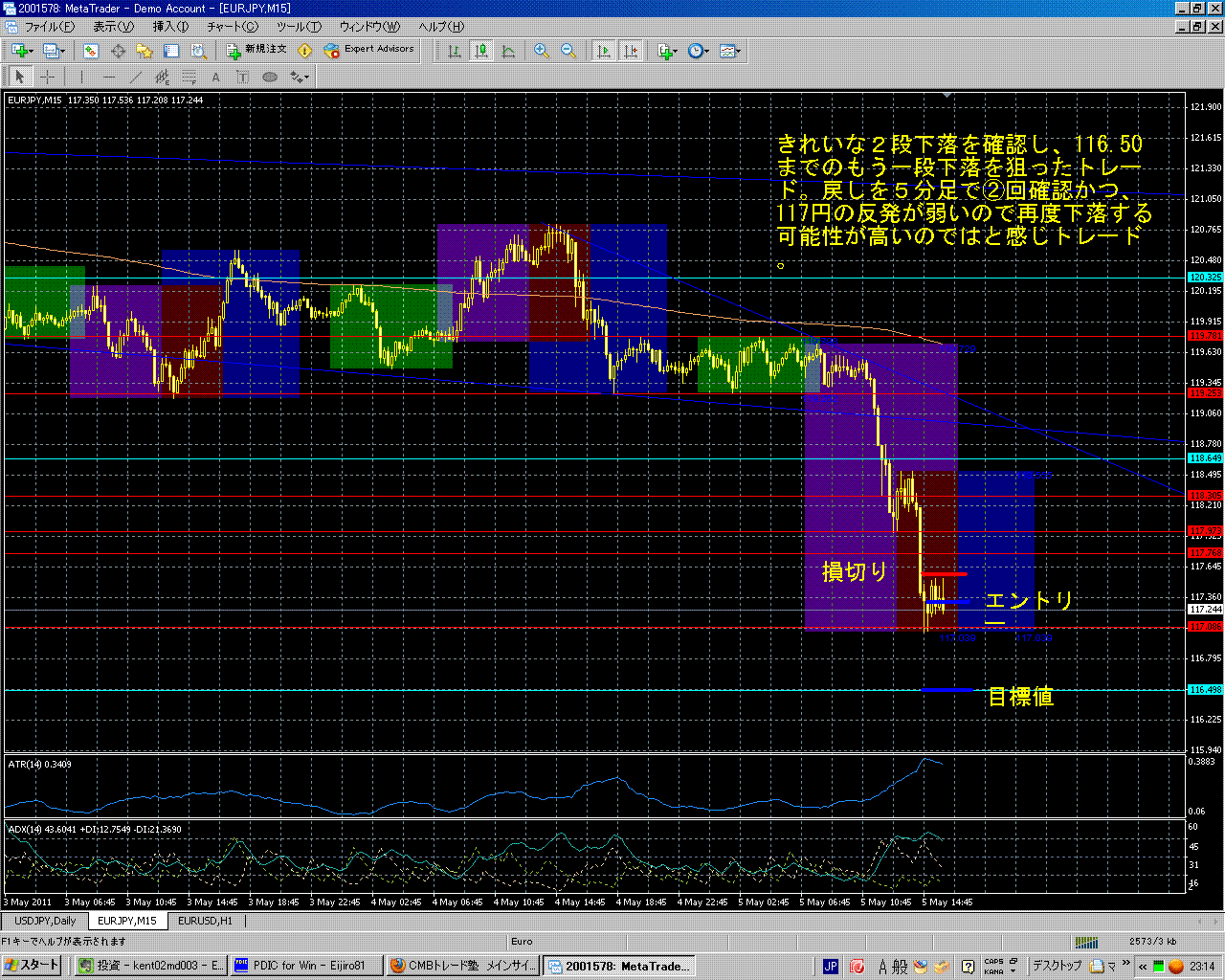 反省点:  事前のイメージどおりの下落とは行かなかったものの、きちんと116.50のターゲットまで下落しており、変則的な3段下げで下落していた。利食いは就寝前に、V字反発を確認後利食い。その後チャートを見てみると、ターゲットまで達していた。頭と尻尾が取れると、100pips程度の利益が出たことになるが、それは結果論であるのでまぁよし。利食いの時に、チャートのパターンと稼いでいるお金が気になってしまっている気がする。これは改善するべき点。 トレード全般はイメージどおりのトレードだったのでナイストレード。やはり事前のイメージをきちんと図にして、エントリー、損切り、ターゲットの3つを記入するのは必要な作業だなと感じた。