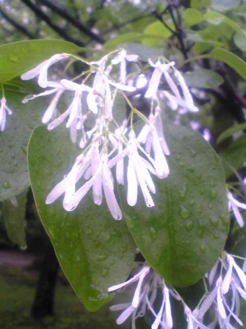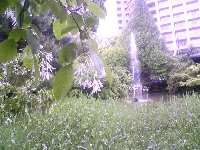 ナンジャモンジャの木がそこらじゅうで咲いています。名古屋市では街路樹に多いです。NHKの朝ドラで紹介された後、ブームが来ました。これは名大病院を見る位置の池の前にもナンジャモンジャがあり、噴水を見ているようです。愛知県の自生地では天然記念物のようです。うちでは、むかし伯父が結婚記念に東京で買って貰ったのを、移植してありました。70年ぐらいまえの話です。