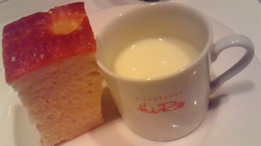 で、頼んだのはもちろんそのモッツァレラチーズが目の前でかけてもらえるというものです。スープとフォカッチャもついてます。