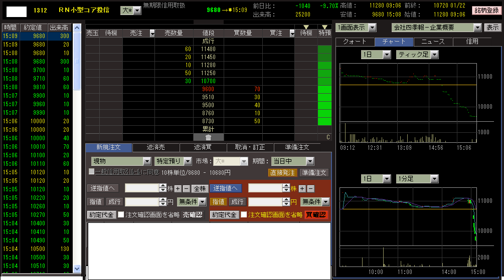 本日の基準価額10848円(推定)に対し、本日終値が9680円と10%超のディスカウント。引け間際の約定記録と引けの板は添付のとおりです。