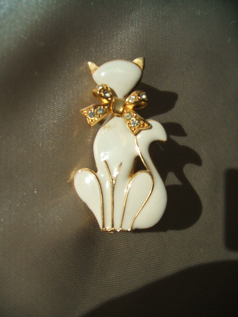さて、きょうの猫ちゃんは白いブローチ。たぶん千円くらいで買ったものです。でも、気に入っているのよ!