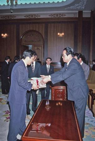 菅首相が1995年3月、自社さ与党訪朝団の一員として平壌を訪れたとき、フォトジャーナリストの山本皓一氏が撮影したもの。当時、対日工作を仕切っていた北朝鮮の金容淳党国際部長(朝鮮アジア太平洋平和委員会委員長)から、菅首相が何かプレゼントを受け取っている写真だ。