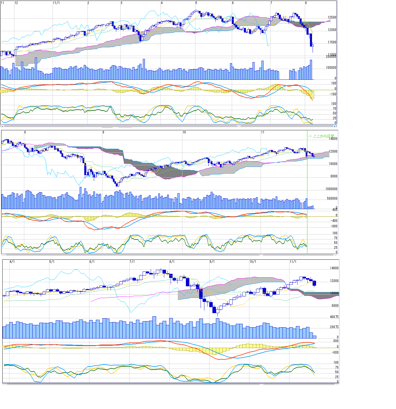 他にも24ヶ月線や100週線、200週線や週足雲下限など、10700~11000には一応抵抗線はあるので、ここらで反発できるか。