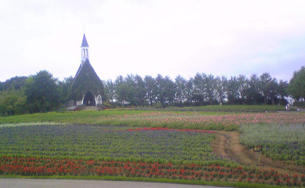 教会と花畑、長野オリンピックの花が咲いていました。