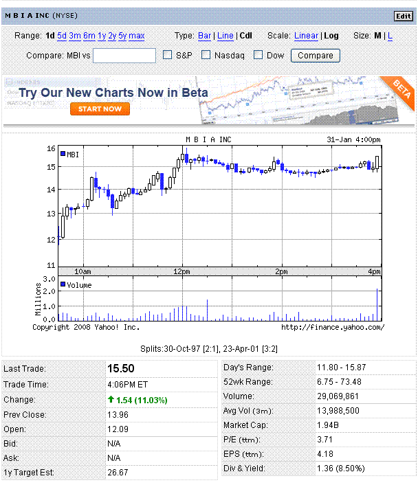 モノライン大手のMBIAがAAAの格付けを維持できるとの見方を示したことから、モノラインへの懸念が薄らぎ大幅反発となりました。結局ダウは、1月は4.6%の下落。強力なグローバル企業が揃っているだけあって他の株価指数に比べてあまり下がっていないです。