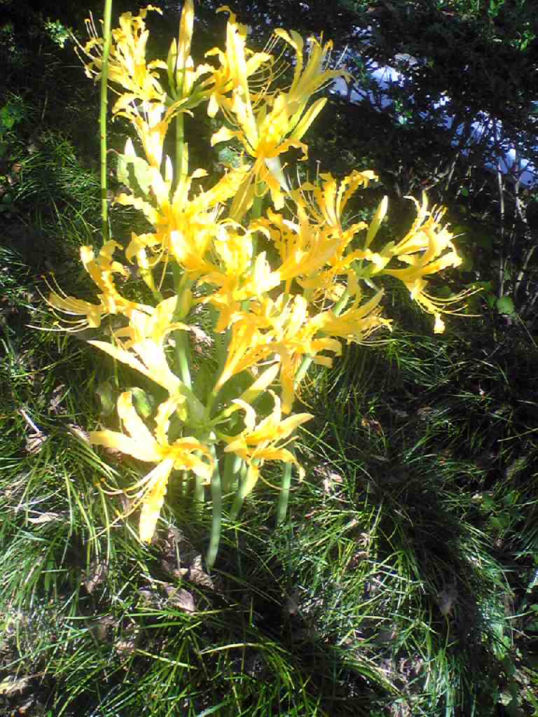 ヒガンバナに良く似たシヨゥエズイセン(ヒガンバナ科)ですと黄色のがありますが、ヒガンバナではほんとに珍しですね。