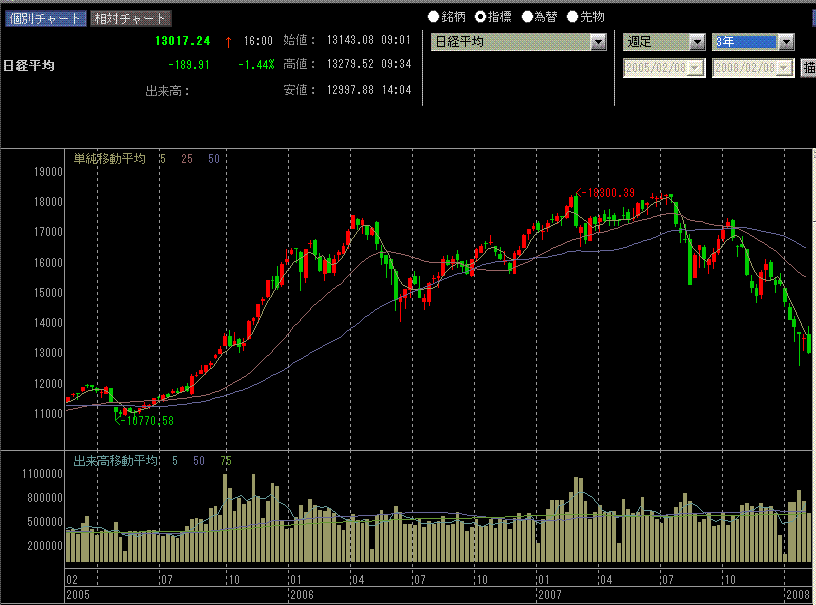 今日は日経平均オプション2月限のSQでした。SQ値は、13,089.98円。朝方発表された12月機械受注が予想を下回ったことから、日経平均はCME終値よりも安く寄り付きました。その後13280円あたりまで戻すも、3連休を控えていることもあり売りに押されていきました。午後からは、東証のシステム障害によりTOPIX先物の売買が停止。相場をさらに冷やした感じです。ちなみにTOPIX先物は東証で、日経平均先物は大証で取引されます。