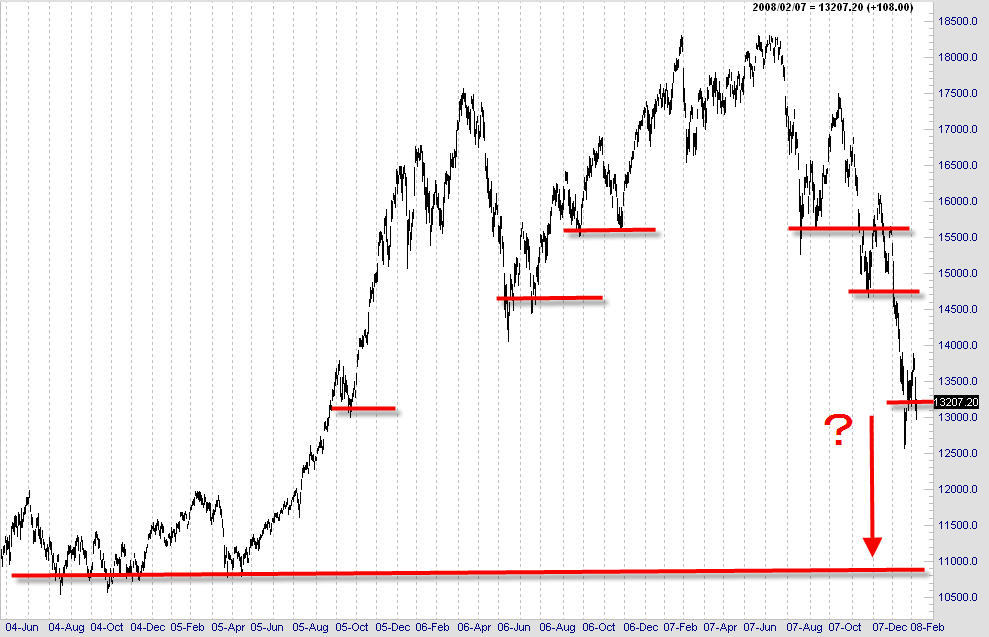 それまで「サブプライムの影響が出るのはまだまだこれから」とか心理的にもネガティブに振れがちですが、13,000円で今しばらく持ちこたえ、その後12,000円台で何とか踏みとどまるのと思います。