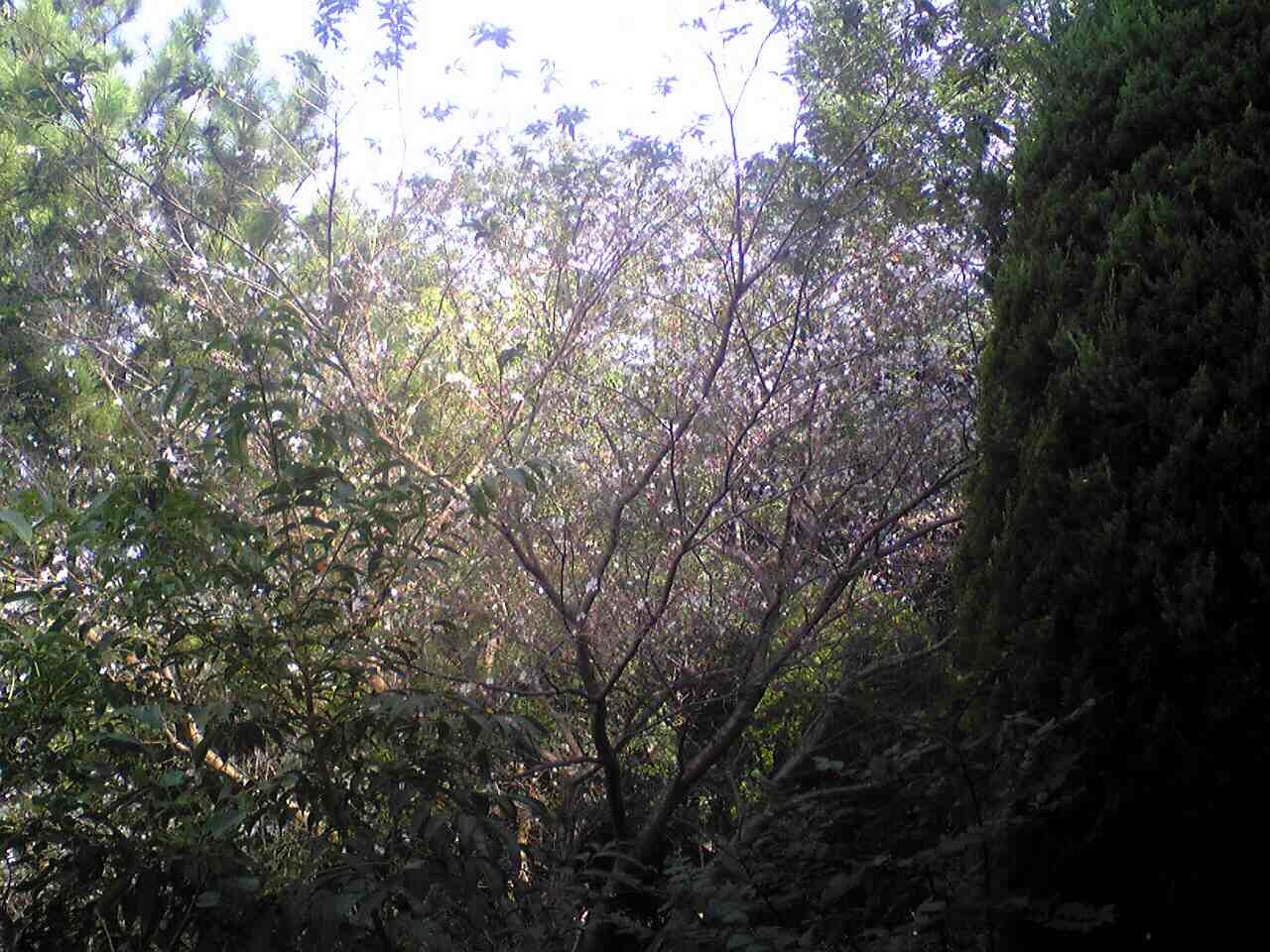 山桜が狂い咲き。カラスがえさにして枝を落としているようだ。