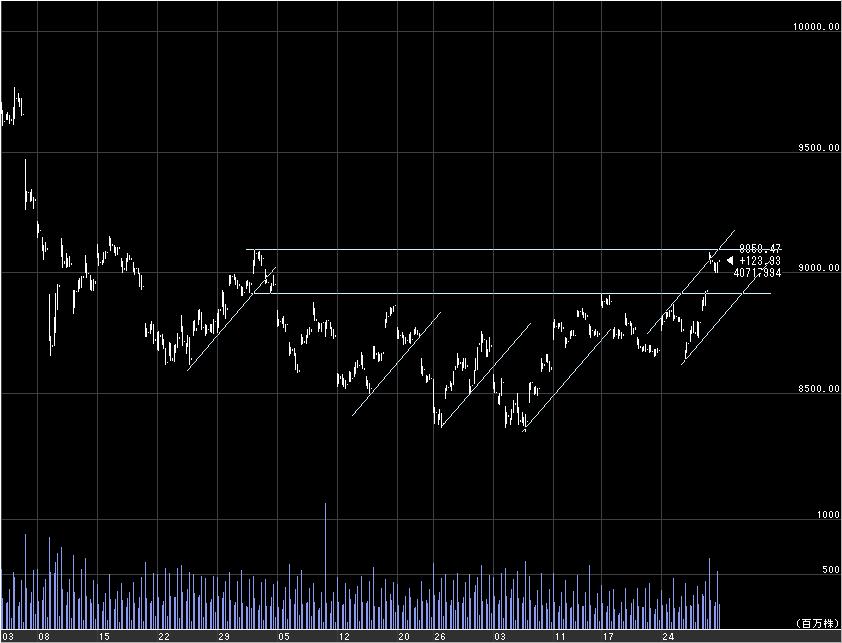 来週前半は調整し、上値を目指してくれることを期待したい。調整目処は五日線、または分足の仮想上昇レンジ下限。