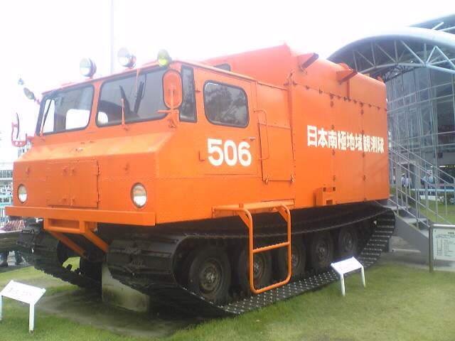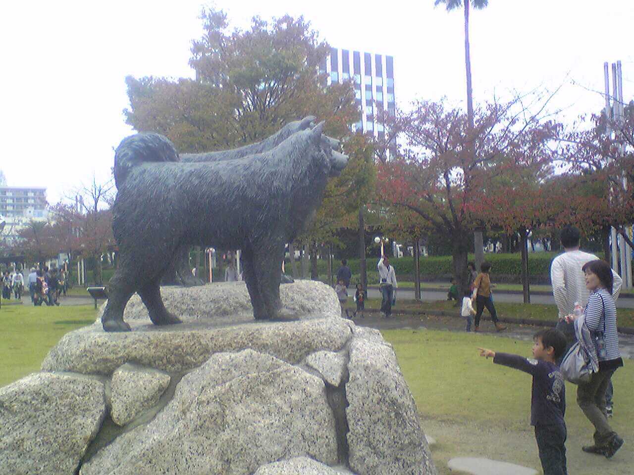 タロ、ジロの銅像の回りも紅葉です。南極観測船の雪上車、南極の様子、ふじのヘリコプター