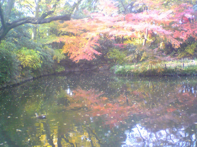 鴨さんが 紅葉の水面をのんびり泳いでいて・・・