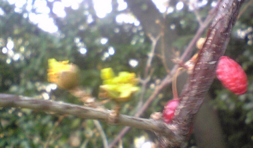 もう咲いていた、さんしゅゆの花、実もまだぶら下がっている。