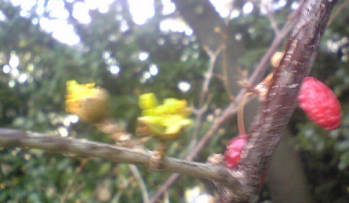 黄色い花から赤い実というと、トマトを思い浮かべましたが、この木とは全然関係ないですね(そもそもトマトは木ではないですし...)。