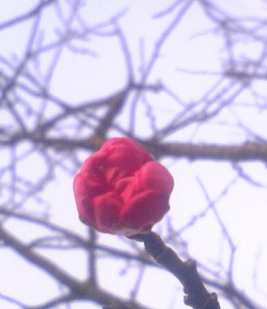 野外での紅梅は昨日が初めて、今年は寒が遅れていたので、花芽の分化が遅れ12月に咲かなかったのだろうか?秋が遅れ、紅葉がようやく終わり、冬が来た感じ、春はまだ遠い。日本の状態みたい。大高緑地にて。2012.1.10
