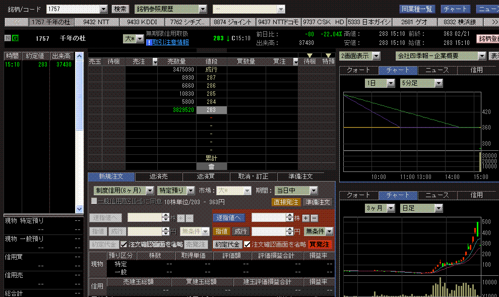 ・千年の杜が二日連続でS安。鋭角に上昇して短期で数倍になるタイプの仕手株は、時価総額200-300億円くらいが限界のケースが多い印象です。過去の日記にも何回か書いているので今更細かくは書きませんが、仕手株やボロ株は近寄らない方が良いですね。反社会勢力の資金源になるケースもありますし。