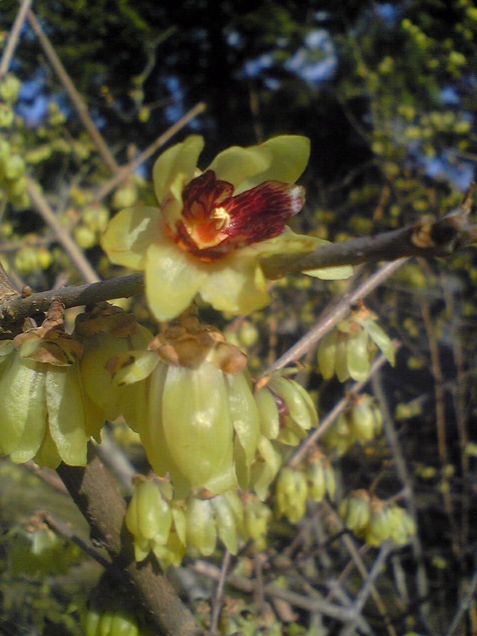 ロウバイの花びらが凍傷をおこしているかのように見えますね。