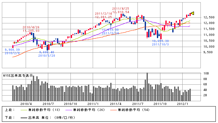 画像左は好調な紐育ダウの週足チャート。言うまでもなく上り調子で、昨年7月から10月にかけて調整があったものの、その後見事に盛り返し、13週線(緑色)が26週、52週をきれいに上抜けた力強い動きを示しておりまする。移動平均線は全て上向きで、依然堅調なチャートでござりまする。