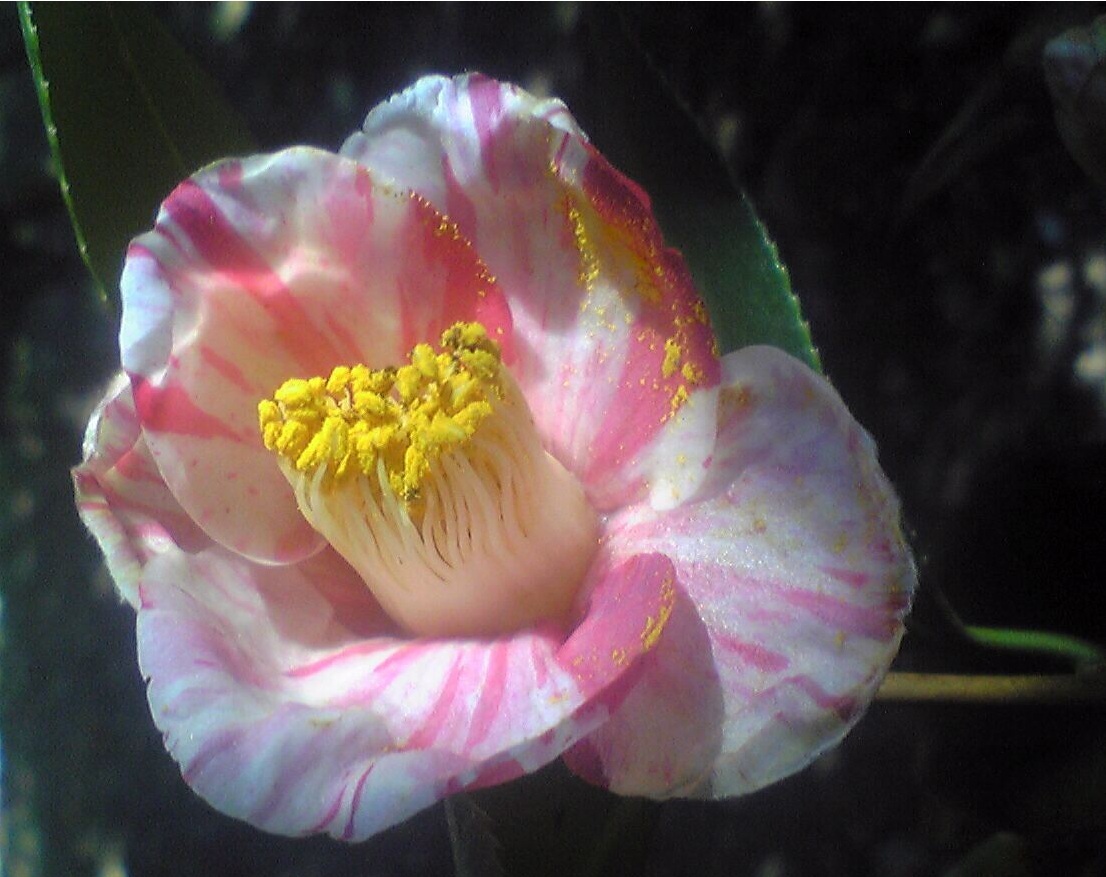 真っ白の椿に絵具でピンクの線を入れたら、こんなふうになるのでしょうか。