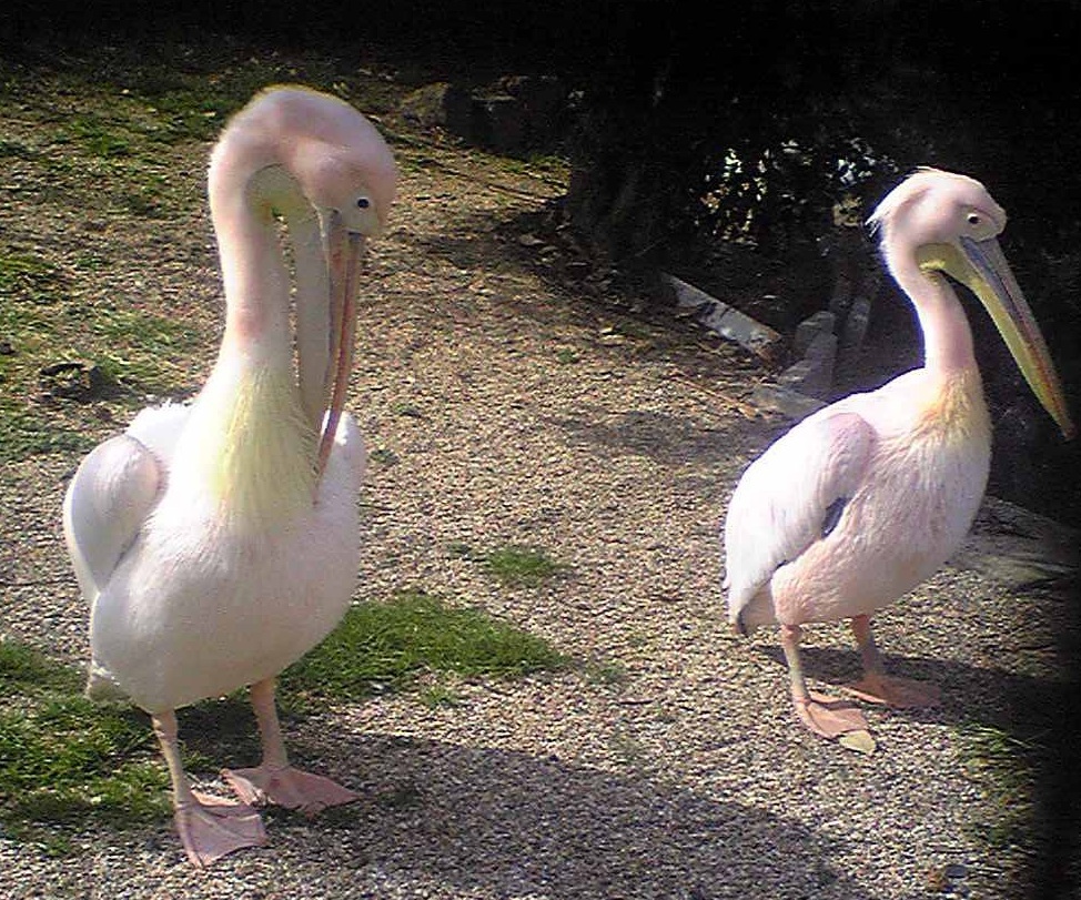 仲のいいモモイロペリカン。口でガアガアやったら反応してくれた。寝てたみたいだ。目がかわいい。カラスが餌時に来て、取って行ってしまう。鵜もペリカンのおなじ仲間だ。