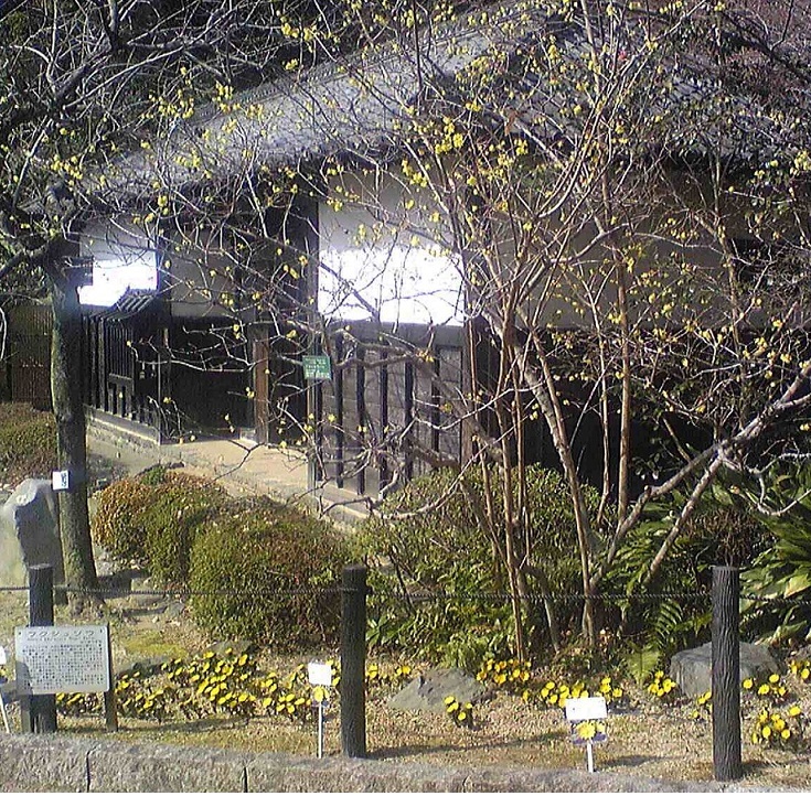 東山植物園の武家屋敷の門にソシンロウバイやフクジュソウがいっぱい咲いています。