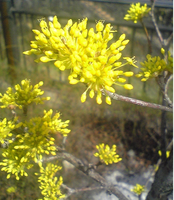 黄色い花を咲かせます。朝鮮半島から中国にある「サンシュユ」ときわめて似ています。