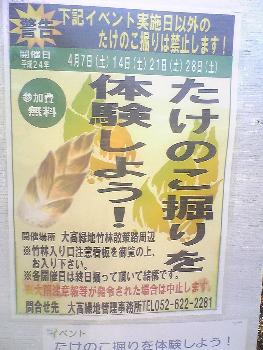 今年も大高緑地で竹の子を掘ろうというイベントが行われます。桜も遅れ気味で、最終週が狙い目かと。まで一個もみません。(ベニシジミ)蝶々も来ています。のんびり蝶や桜を見たいですね。