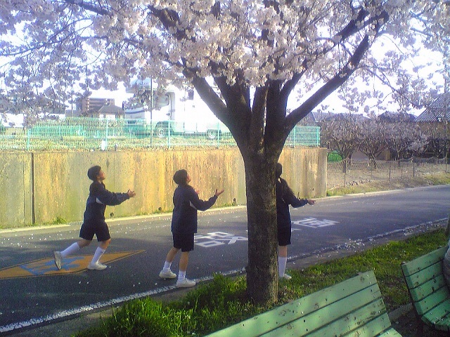 中学生でしょうか?風に舞う桜で遊ぶ・・なんだか風流に思います。