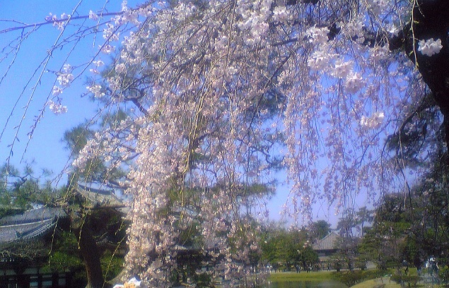 しだれざくらと浄土式庭園の阿字池の向こうに鳳凰堂